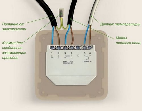 При подключении проводов и терморегулятора нужно опираться на схему. А еще важно обеспечить быстрый доступ к термодатчику, если он выйдет из строя. По этой причине его располагают ближе к крайней точки теплого пола.